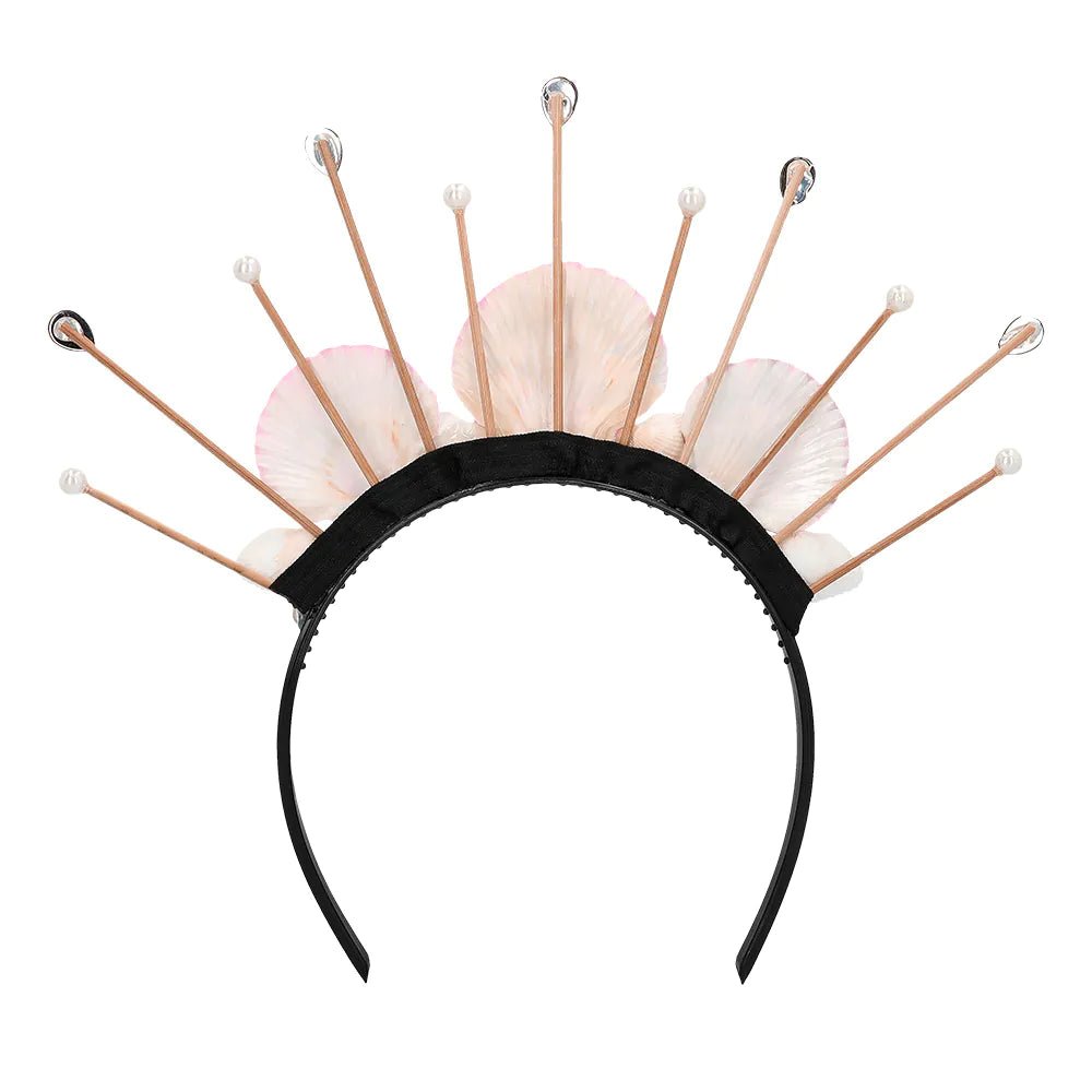 Kaunis halo kruunu, jossa on vaaleanpunaisia simpukoita ja kiiltäviä kiviä taianomaista Boho-lookia varten. Diademi sopii täydellisesti festivaali- tai ranta-asuun, jossa on merellisiä vaikutteita, mutta on myös ehdottomasti ainutlaatuinen asuste täydentämään merenneitoasua karnevaaleihin tai naamiaisiin.
