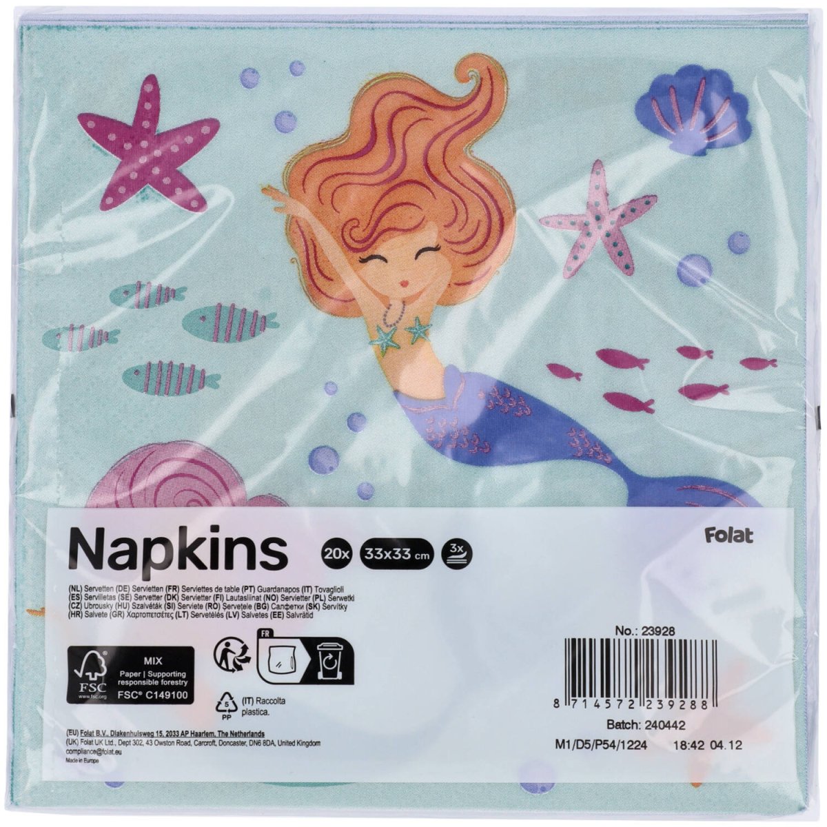 Kaikki merenneidot pöytään! Servietit - Merenneitojen taikaa - 33 x 33 cm - 20 kpl. Sisältö: 20 lautasliinaa. Käytettäväksi esimerkiksi seuraavissa juhlissa/juhlatilaisuuksissa: Lastenjuhlat, Syntymäpäivä. Servietit, joissa on kauniita merenneitoja ja heidän vedenalaisia aarteitaan. Lautasliinoissa on violetti/sininen puoli, jossa on 1 merenneito ja teksti "HAPPY BIRTHDAY" ja mintunvihreä puoli, jossa on 2 merenneitoa. Nämä lautasliinat kuuluvat Folat Mermaid Magic -mallistoon. Tämä tuote on valmistettu paperista.