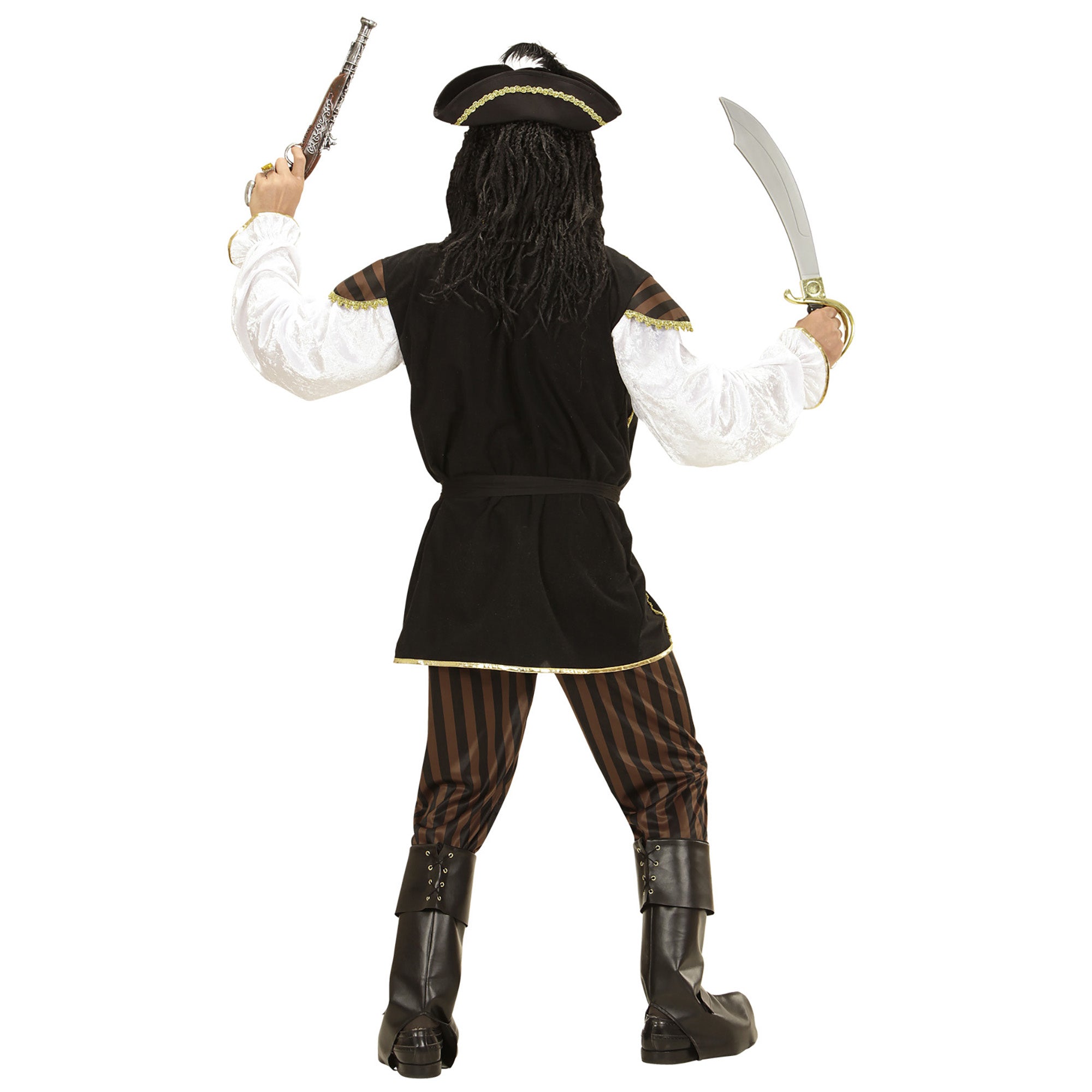 Kuvaus: merirosvokapteenin paita liivillä, housut, vyö, hattu höyhenellä, saappassuojat