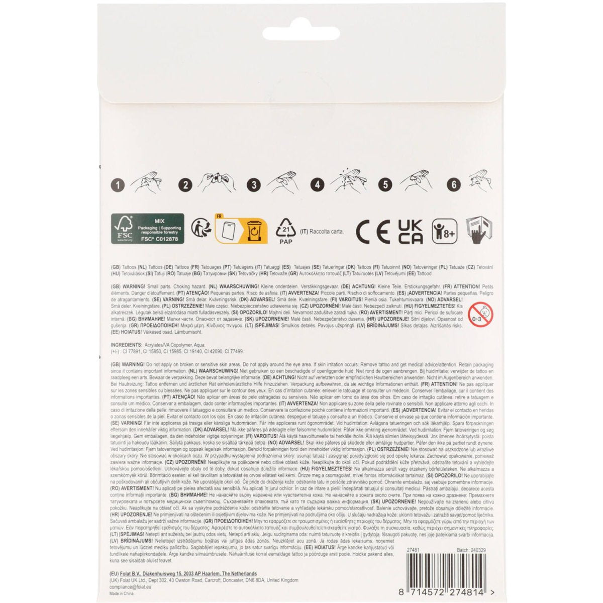Näin näytät oikeasti merirosvolta! Tatuoinnit - Pirate Party - 25 kpl. Sisältö: 1 tatuointitarra-arkki, jossa on 25 tatuointia. Käytettäväksi esimerkiksi seuraavissa juhlissa/juhlatilaisuuksissa: Lastenjuhlat, Syntymäpäivä, Teemajuhlat. Nämä siistit ja seikkailulliset tekotatuoinnit tekevät juhlista täydelliset. Pakkauksessa on 1 tatuointitarra-arkki, joka sisältää 25 tatuointia. Pakkauksen takapuolella kerrotaan, miten tatuointeja käytetään. Tarra-arkin koko on 14 x 21 cm. Tämä koristesarja kuuluu Merirosvopuolueiden juhlat -mallistoomme. Tämä artikkeli on valmistettu akrylaatti/VA-kopolymeeristä ja vedestä.