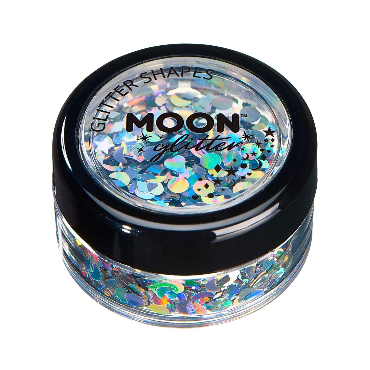Lisää lisäulottuvuutta holografisilla glitterimuodoilla. Tähtiä, pisteitä, sydämiä, puolikuunia ja timantteja. Glitterimme ovat kosmetiikkalaatuisia, joten niitä on täysin turvallista levittää kasvoille, hiuksiin ja vartalolle, ja ne on helppo poistaa pelkällä vedellä.