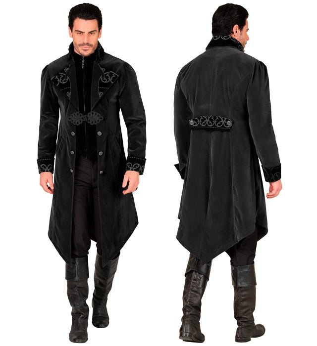 Anna asullesi salaperäinen ja tyylikäs ilme tällä mustalla samettisella goottilaisella miesten takilla. Täydellinen teemajuhliin, goottitapahtumiin, cosplayyn tai Halloweeniin.