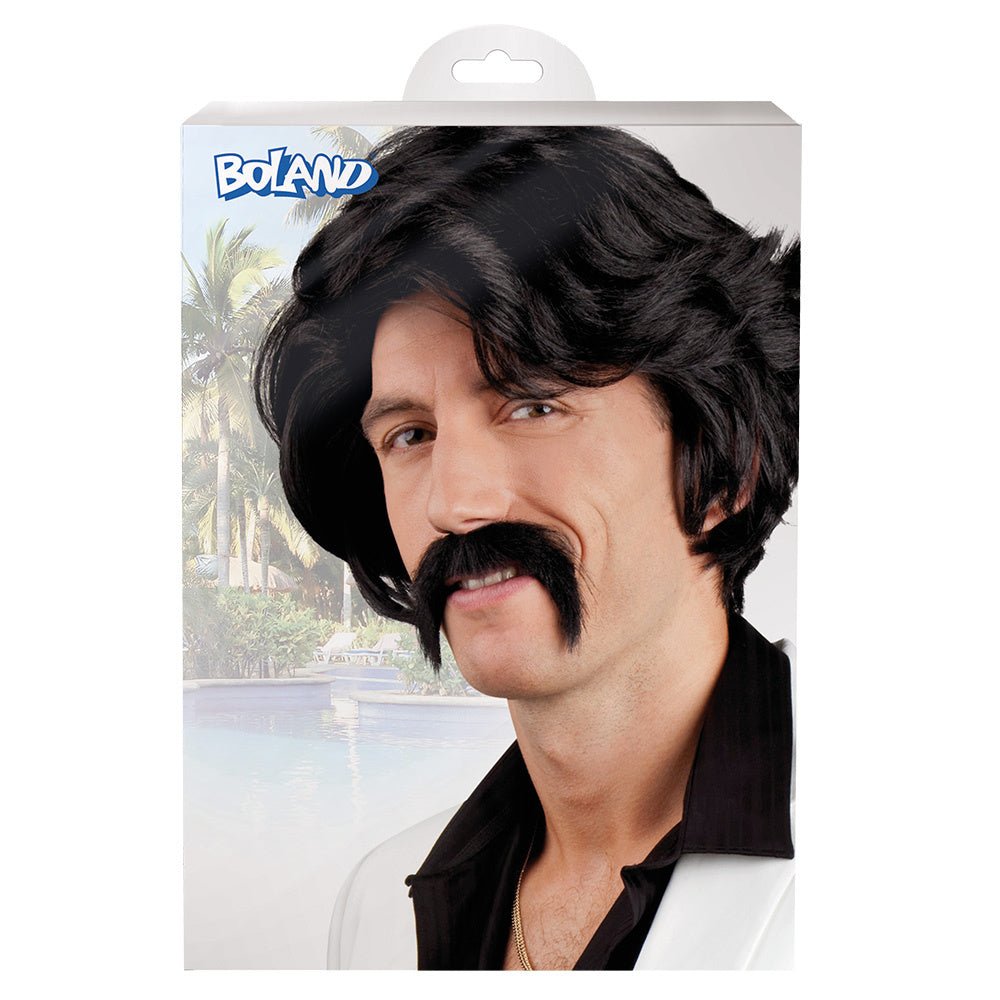 Pakkauksen sisältö: musta peruukki ja viikset
