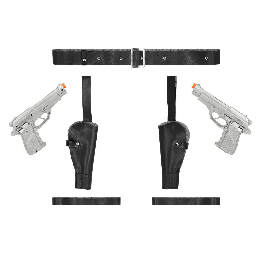 Olitpa sitten pukeutumassa kovaksi seikkailijaksi tai sankarilliseksi poliisiksi, tässä täydellisessä holsterisarjassa on kaikki elementit asun täydentämiseen. Setti sisältää vyön, jalkahihnat, 2 holsteria ja 2 hopeista lelupistoolia. Täydellinen cosplay-tapahtumaan, karnevaaliin tai teemajuhla-asuun.