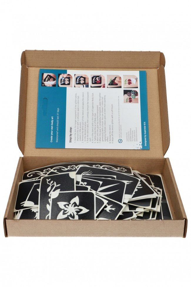 Setti sisältää 100 glittertatuointikuviota. Käytä erityistä iholiimaa ja hienoa glitteriä luodaksesi upeita glittertatuointeja.