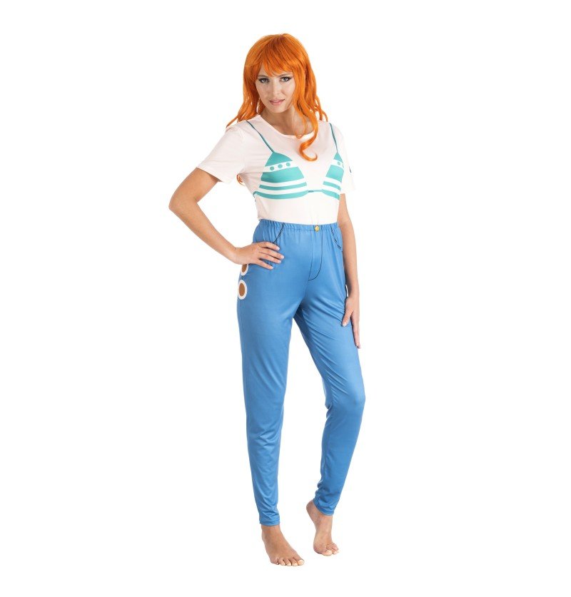 Namin manga-asu One Piece -elokuvasta, johon kuuluu painettu yläosa ja housut.