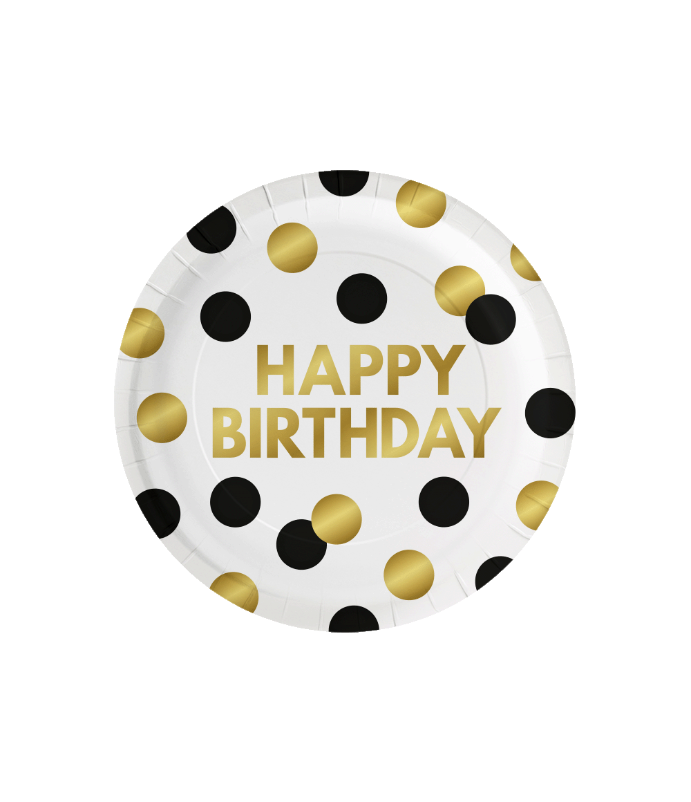Hyvää syntymäpäivää lautaset musta kulta pisteitä 23cm 8kpl