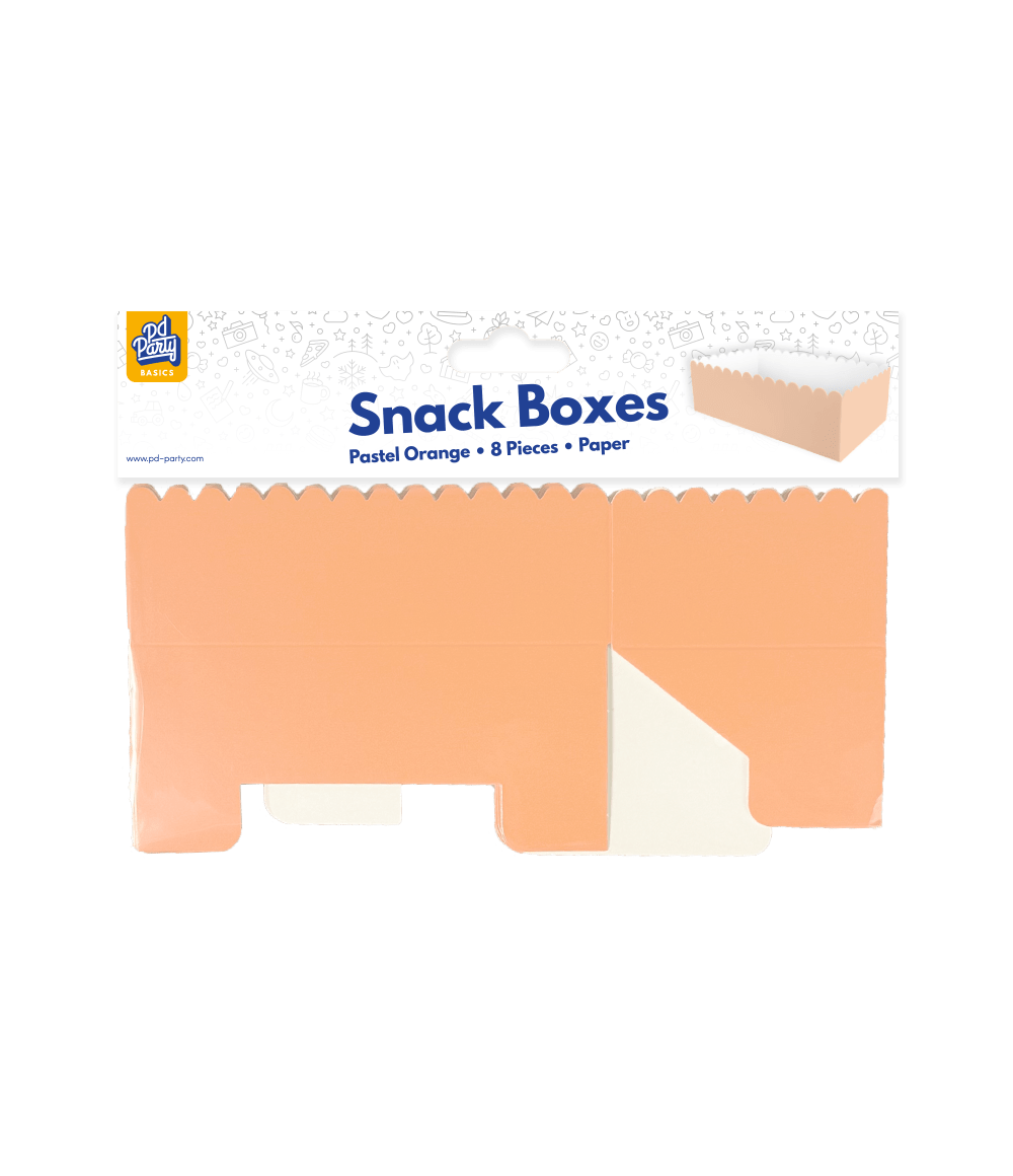 Välipalalaatikot - pastellinoranssi ovat täydellisiä tarjottavia välipaloja, kuten popcornia ja sipsejä, juhlissa, joissa pastellinoranssi on teemana. Nämä välipalalaatikot ovat kooltaan 7 x 7 x 12,5 cm, niitä on 8 kappaletta, ja ne sopivat täydellisesti yhteen muiden pastellinoranssin väristen tavaroiden, kuten konfettien, lautasliinojen, lautasten, pöytäliinojen, kuppien ja lippusiiman kanssa. Esittele nämä tuotteet yhdessä, jotta asiakkaalle on heti selvää, mistä tämä kokoelma koostuu. Nämä välipalalaatikot on valmistettu paperista, joten ne ovat ympäristöystävällinen valinta!