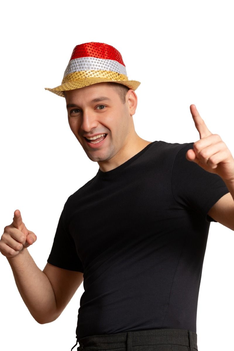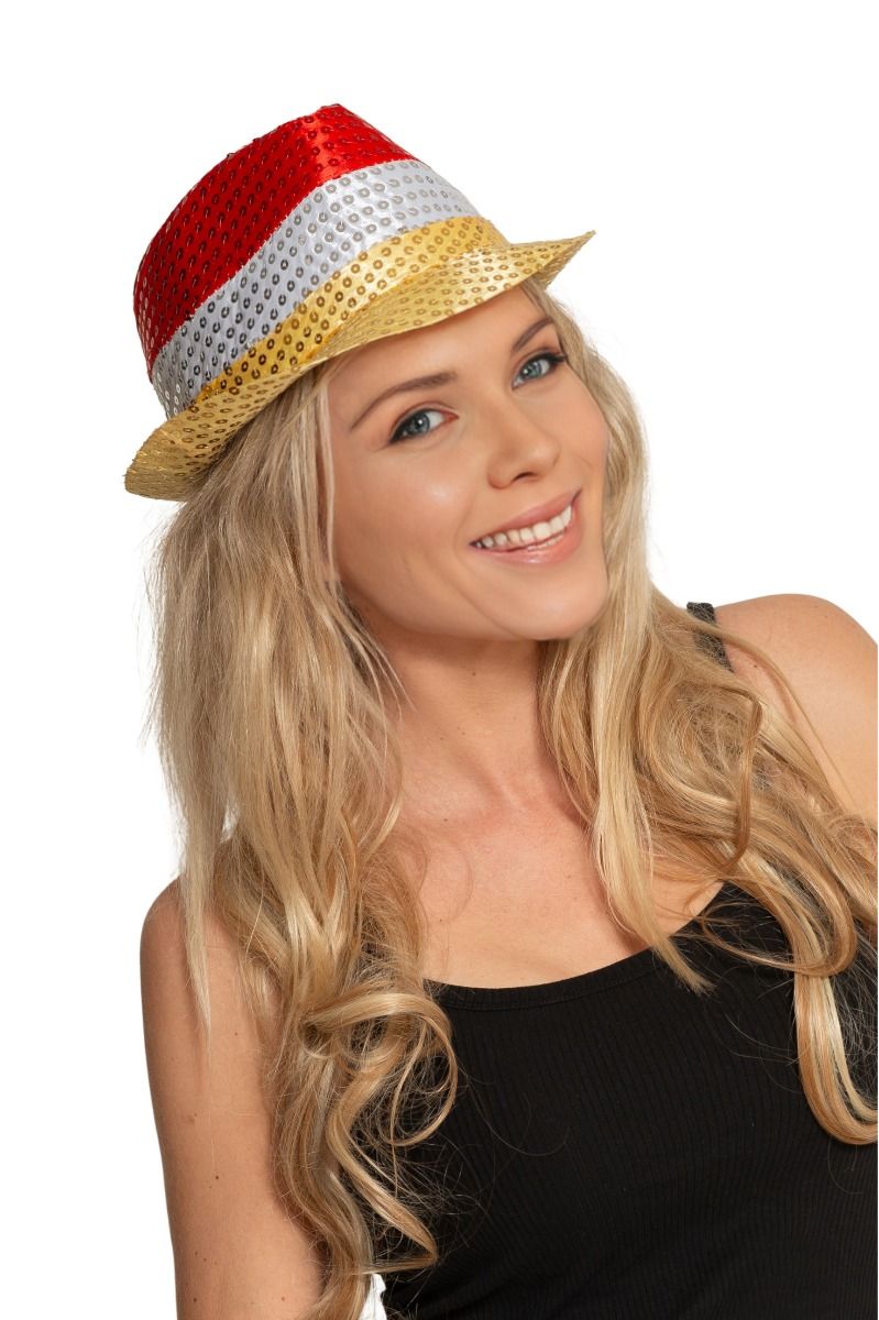 Punainen/valkoinen/keltainen paljettihattu, jossa on valo ja paristot