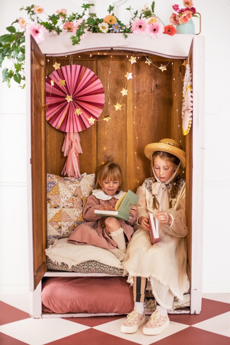 Koristeelliset ruusukkeet Kukat, värisekoitus, vaaleanpunaista paperia, jossa hapsut, halkaisijat kokoamisen jälkeen n. 26 cm, 35 cm, 43 cm.