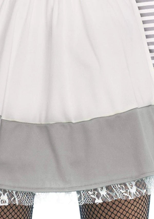 🔹 Raidallinen mekko ja pom-pom-yksityiskohdat tuovat leikkisän lisän, kun taas pitsinen kaula-aukko luo karmivaa tunnelmaa