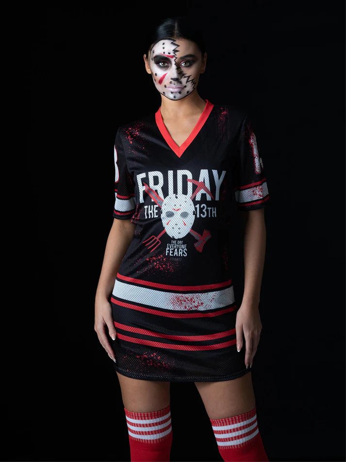 Muodosta itsesi klassisen kauhuilun näköiseksi tämän Perjantai 13. päivä -naisten puvun avulla. Puvussa on jääkiekkokuvio ja se sopii täydellisesti Halloweeniin, teemajuhliin tai cosplayyn.