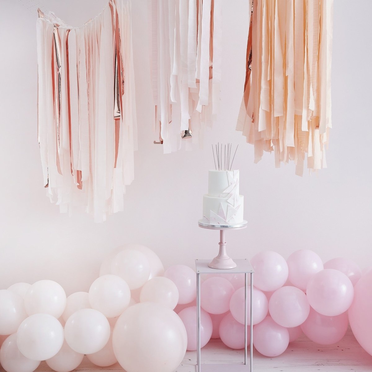 Herätä juhlat eloon tällä upealla vaaleanpunaisen ja ruusukullan sävyisellä juhlakattotaustalla - vieraat jonottavat täydellistä juhlaselfietä varten! Mukana toimitetaan yli 300 metrin pituiset virtaviivat, joten näyttävästä valokuvataustastasi tulee jotain ihailtavaa. Olemme toimittaneet jokaiseen pakkaukseen verkkoverkon, liimapisteitä ja narun, jotta tämä tausta olisi vaivaton.