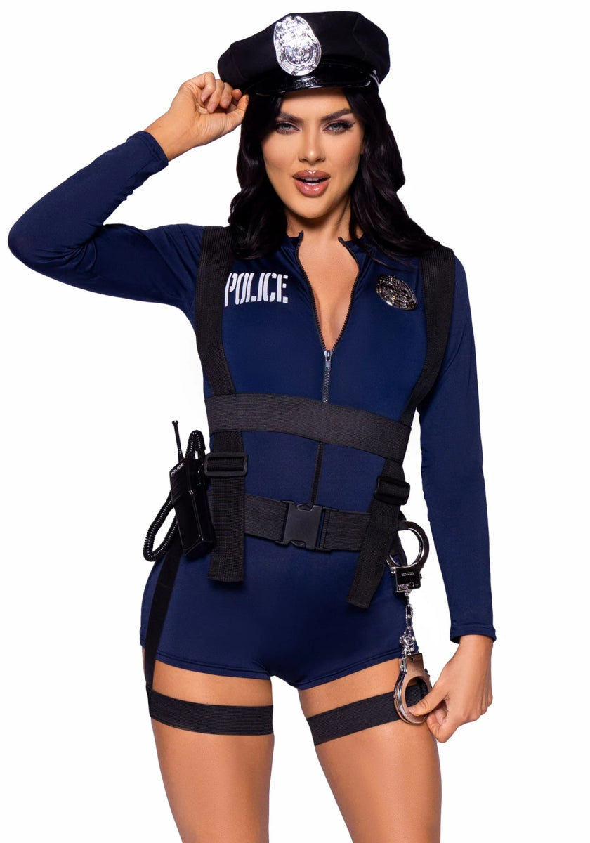 Jätä seksikkäät ajatuksesi valloilleen Leg Avenuen Flirty Police Costume -asussa! Tämä tummansininen bodysuit, jossa on edessä vetoketjukiinnitys, pitkät hihat ja pinneillä kiinnitettävä virkamerkki, tekee sinusta huomion keskipisteen. Valjaat sukkanauhavyöllä, käsiraudat, leluradiopuhelin ja yhteensopiva poliisilakki viimeistelevät ulkoasun, joten olet täydellinen valinta karnevaaleille, Halloweeniin tai naamiaisiin. Oletko valmis rikkomaan sääntöjä tyylillä? 💋💼