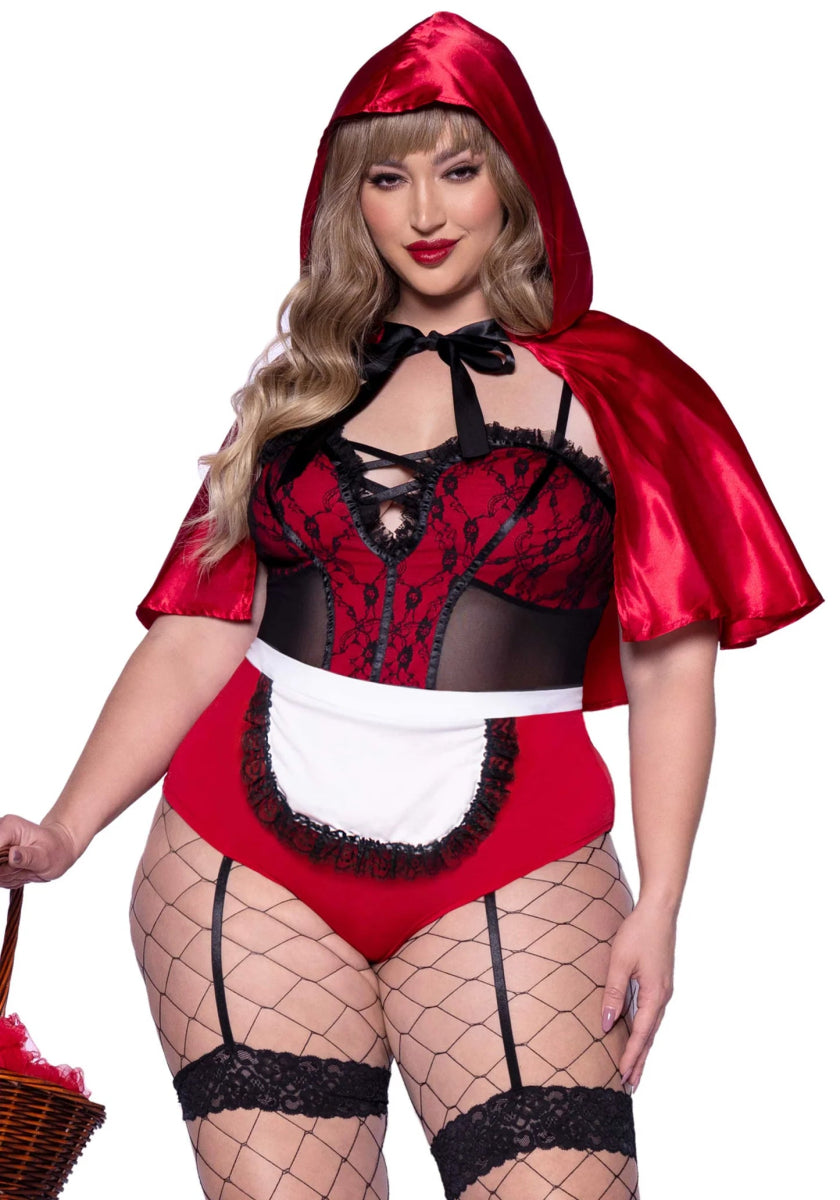 Susi löytää sinut varmasti tässä viettelevässä Tuhma Punahilkka Plus Size -puvussa Leg Avenuelta! Tämä lumoava 3-osainen kokonaisuus sisältää pitsisen henkselipuseron, jossa on läpikuultavia yksityiskohtia ja erityisen röyhkeä istuvuus, pitsisen esiliinan ja satiinisen hupullisen viitan, jossa on rusettisuljenta. Täydellinen satumaiseen Halloween- tai karnevaalijuhlaan! 🌲✨