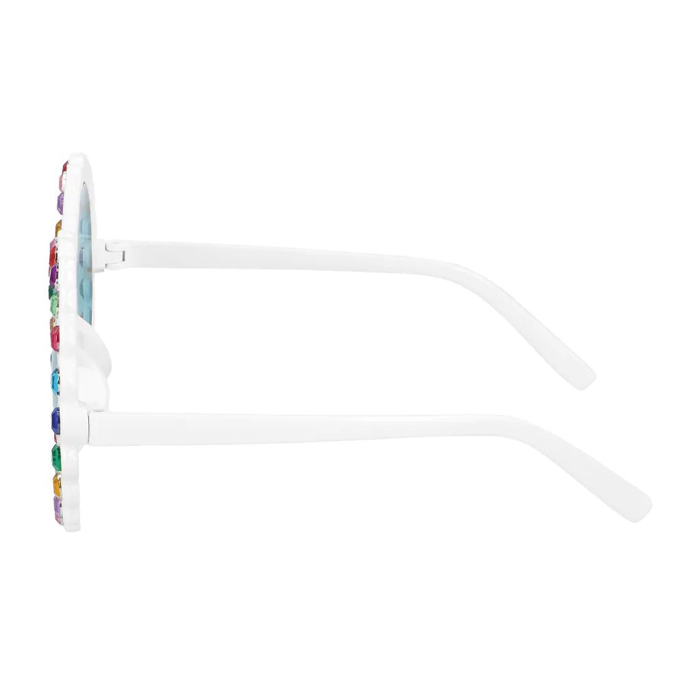Varasta show näillä lumoavilla ja iloisilla laseilla! Valkoinen kehys, suuret pyöreät linssit ja sateenkaaren väriset kimaltelevat jalokivet ympäriinsä tekevät tästä asusteesta asusteen, jolla erotut suurena ja värikkäänä Pridessä, festivaaleilla tai hippiteemaisissa juhlissa.