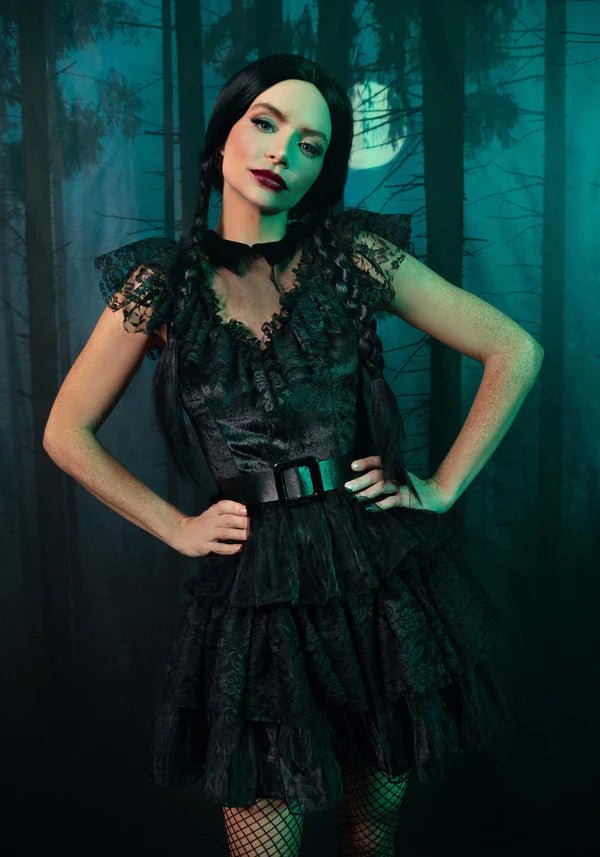 Hyppää lumoavaan maailmaan 3-osaisella Raving Rebel -asulla! Tämä ainutlaatuinen kokonaisuus sisältää sametti- ja pitsimekon, eteerisen organzakerroshameen, vyötärönauhavyön ja rohkean veitsenmuotoisen hiusklipsin. Juhlitpa sitten halloweenia tai halusitko antaa lausunnon karnevaaleilla, tämä puku saa sinut loistamaan tyylikkyyden ja kapinallisuuden yhdistelmällä. 🔪💃