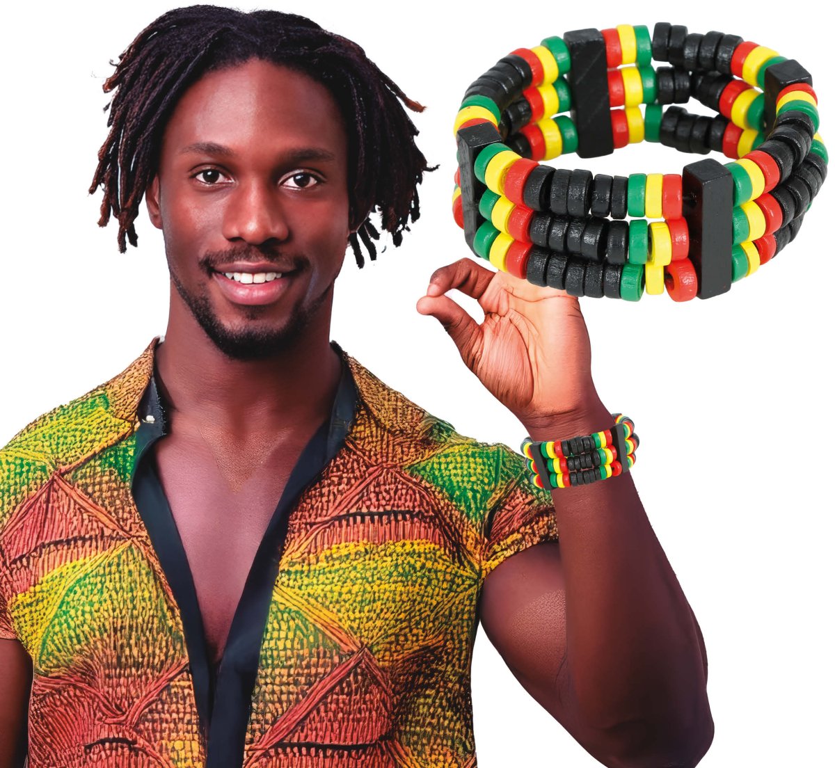 Trendikäs Rasta-tyylinen rannekoru, joka on valmistettu puusta ja jonka värit ovat musta, keltainen ja vihreä. Täydellinen antamaan asuusi iloisen ja värikkään säväyksen tai asusteeksi teemajuhliin ja festivaaleille.