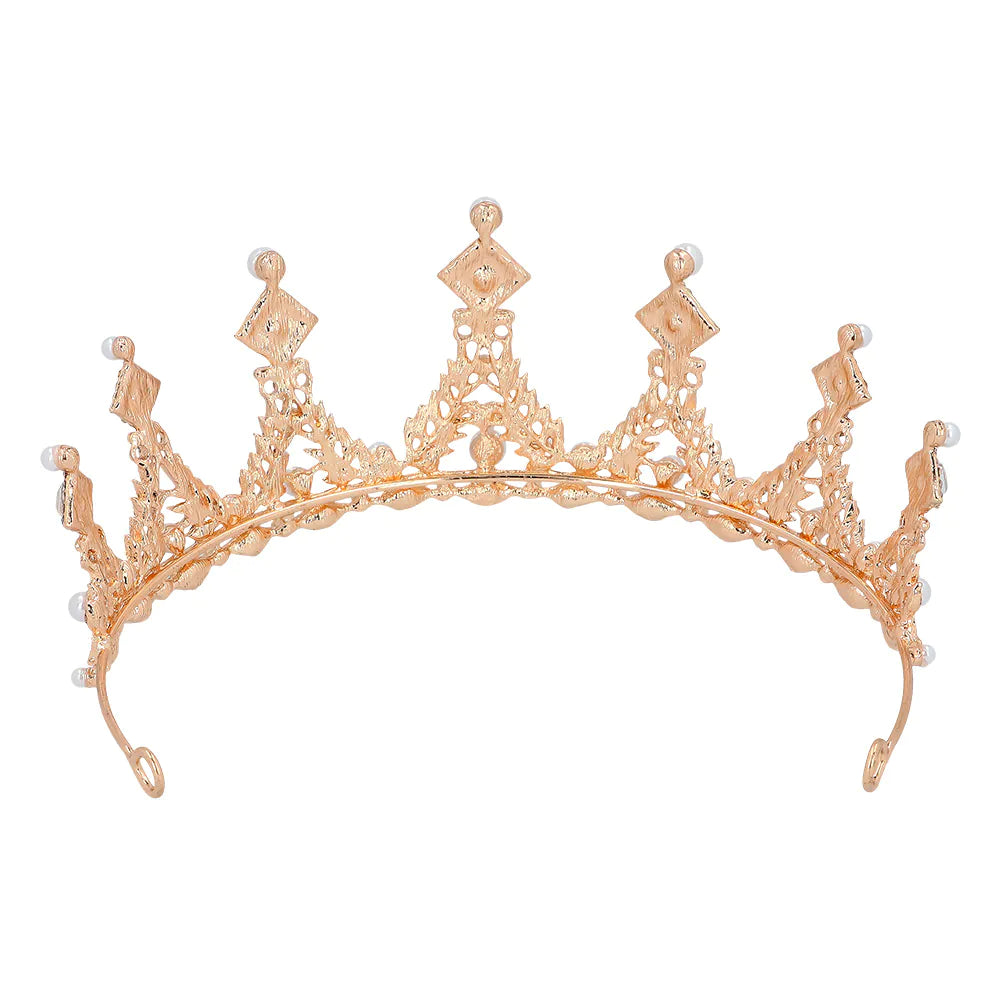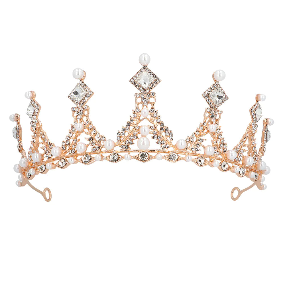 Tämä ylellinen metallinen tiara sopii täydellisesti kuninkaallisten prinsessojen ja/tai kuningattarien asuun. Ruusukultainen kruunu on koristeltu helmillä ja kimaltelevilla kivillä, joten tämä tiara on täydellinen hiuslisävaruste erottumaan karnevaaleissa tai pukujuhlissa.