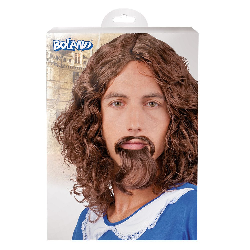 Ruskea peruukki muskettisoturi, jolla on viikset ja parta