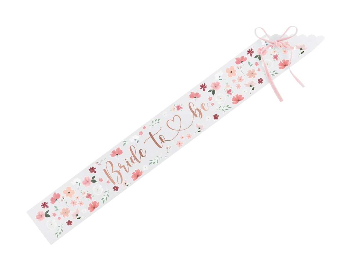 Morsiamen paperinauha, valkoinen, värillinen painatus ja metalloitu ruusukultainen kirjoitus, leveys n. 9,5 cm, pituus n. 76 cm.