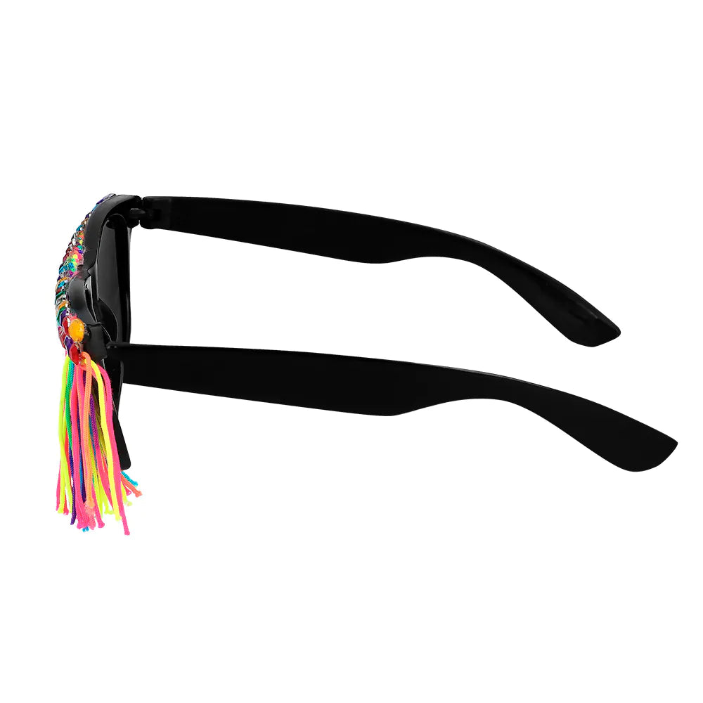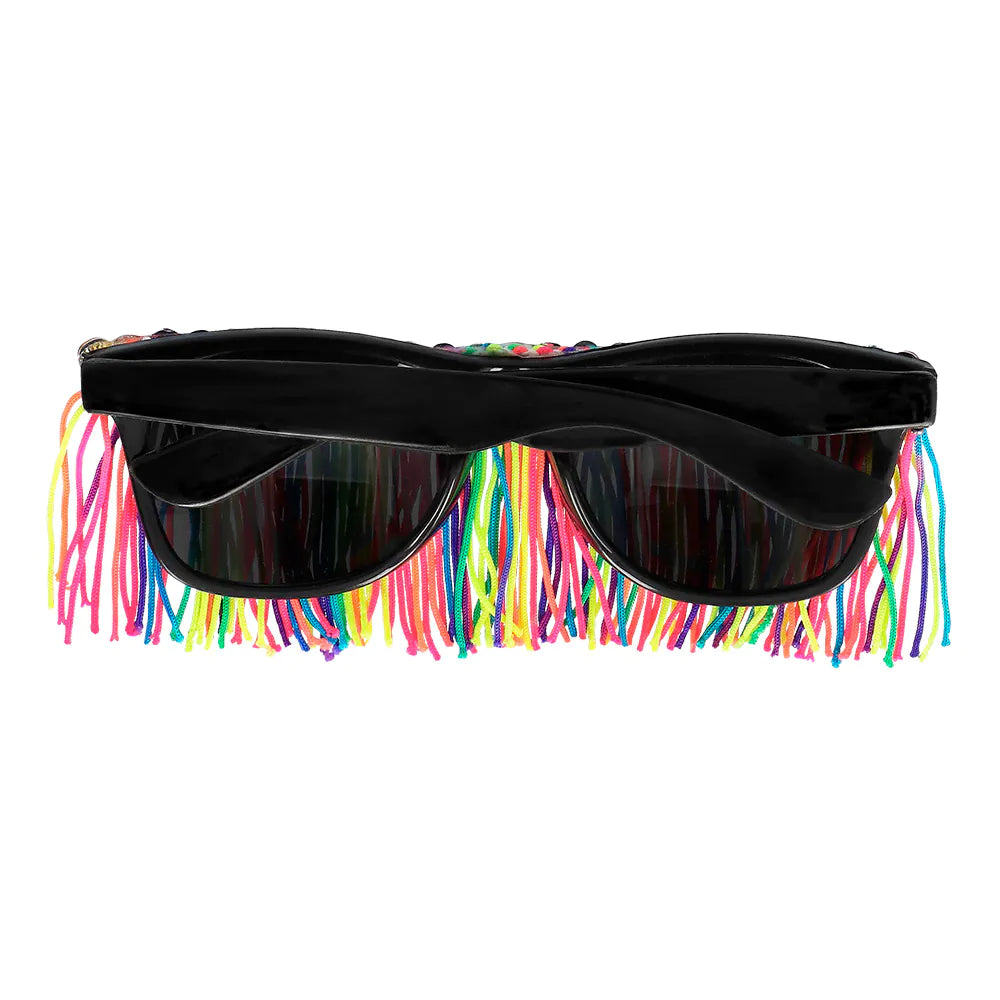 Lisää leikkisää ja värikästä twistiä kaikkiin juhlalaseihin näillä hapsuisilla juhlalaseilla. Kehyksessä on värikkäitä hapsuja ja kiiltäviä kiviä, jotka luovat ekstravagantin ilmeen, joka sopii täydellisesti festivaaleille, naamiaisiin tai karnevaaleihin. Lyhyesti sanottuna täydellinen lisävaruste huomiota herättävään juhla-asuun!
