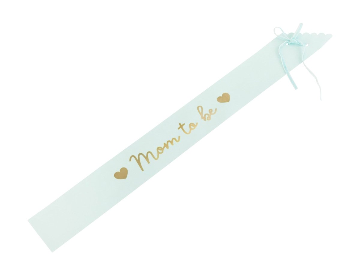 Vyötärö vaalean tiffaninsinistä paperia, jossa kultainen kirjoitus "Mom to be", leveys n. 9,5 cm, pituus n. 75 cm.