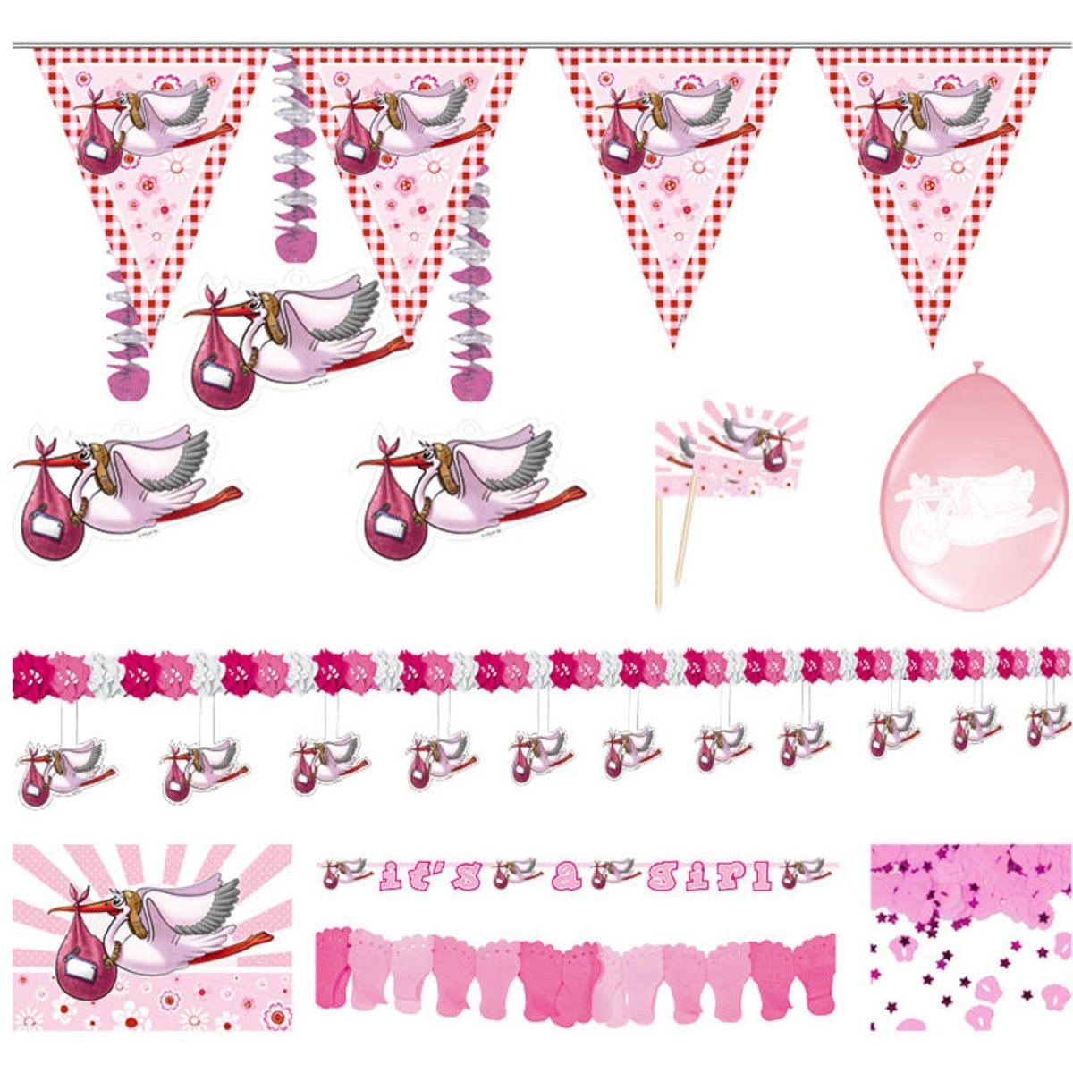 Party-pakkaus Syntymäaikainen tyttö. Sisältö: 8 ilmapalloa, 1 lippusiima, 1 kranssi, jossa on alla ripustimet, 1 ikkunalippu, 1 kirjain kranssi, pöytäkonfetti, 3x ripustettavat koristeet, 1 paperikranssi ja 50 hammastikkua. Käytettäväksi esimerkiksi seuraavissa juhlissa/juhlatilaisuuksissa: Tytön syntymä. Pakkauksen mitat ovat 35 x 26 x 10 cm. Tuote on valmistettu pahvista.