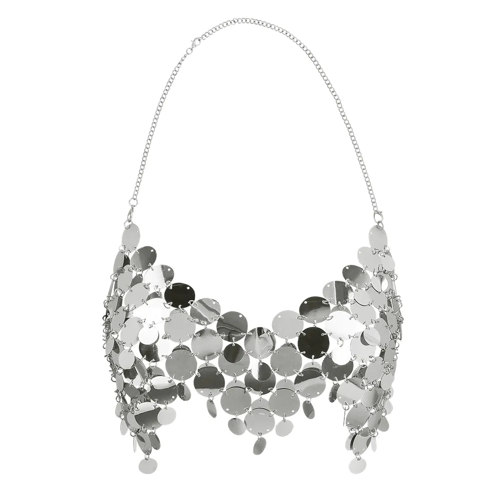 Loista kaikissa juhlissa tällä upealla hopeisella paljettitopilla! Täydellinen festivaaleille, klubi-iltaan tai seksikkäisiin teemajuhliin. Hohtava toppi on koristeltu suurilla, huomiota herättävillä paljeteilla, jotka liikkuvat kauniisti jokaisella askeleella. Avoin selkäosa, jossa on tyylikäs linkkikiinnitys, takaa mukavan ja säädettävän istuvuuden.