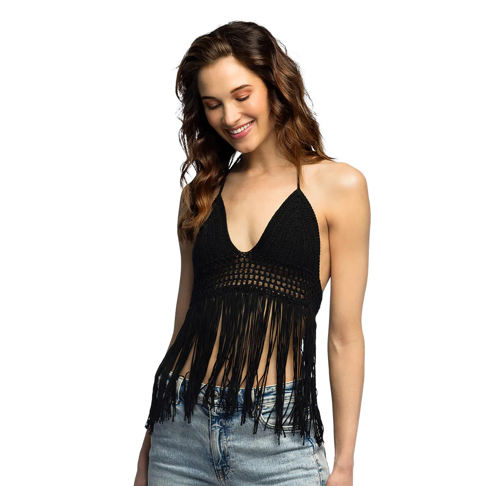 Anna auringon paistaa tällä söpöllä mustalla virkatulla topilla koossa M! Koristeellinen kuvio keskellä ja leikkisät hapsut alareunassa antavat crop-toppiin todellisen boho-lookin. Täydellinen katseenvangitsija festivaaleille, rantajuhliin tai aurinkoiseen päivään kaupungissa.
