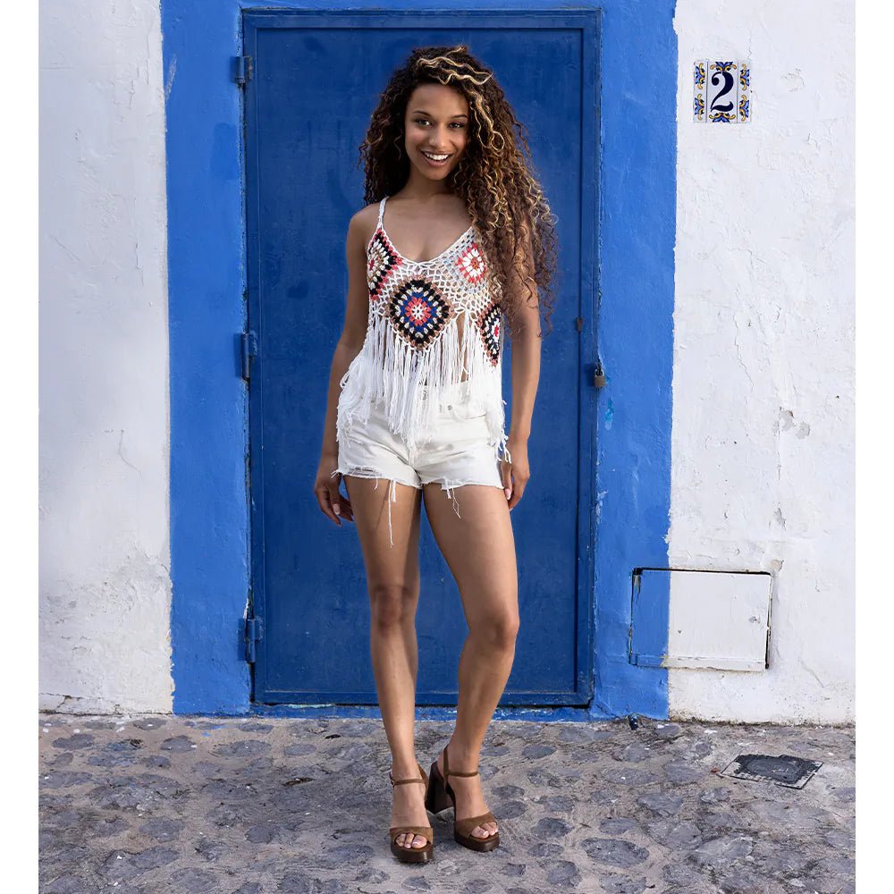 Pirteät ruutukuviot ja retrovärit antavat tälle virkatulle topille leikkisän boho-lookin, joka sopii täydellisesti aurinkoisiin päiviin, kesäjuhliin ja festivaaleille. Ilmava materiaali, miellyttävä istuvuus ja paneelihapsut tekevät tästä crop-topista koossa M jokaisen juhlavaatekaapin must-have-kappaleen.