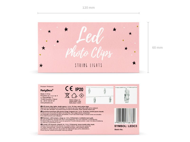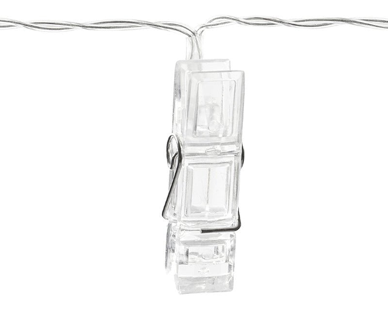 LED-valoklipsivalot, kirkas kirkkaalla johdolla, johdon pituus valojen kanssa n. 1,4 m, 10 kpl, valon väri lämmin keltainen. Sopii sekä sisä- että ulkokäyttöön. Toimii paristoilla. Valoja ei voi liittää valosarjoihin.