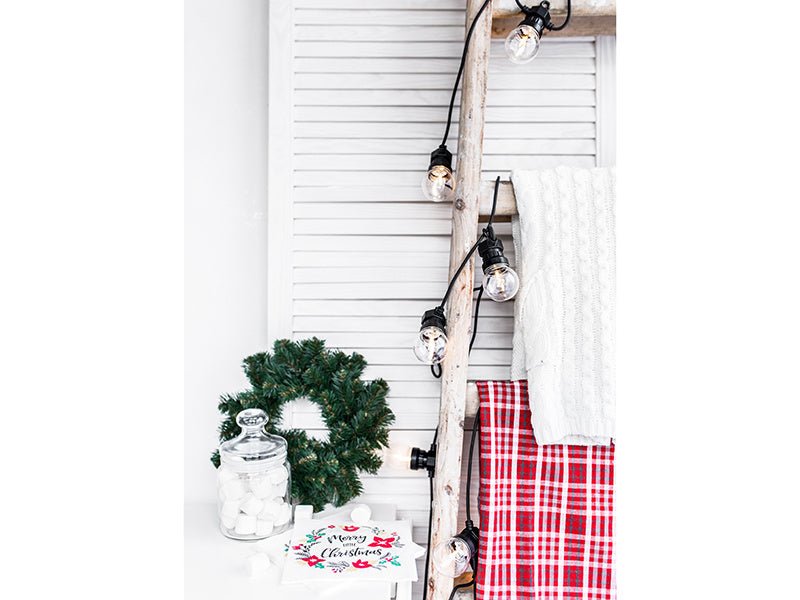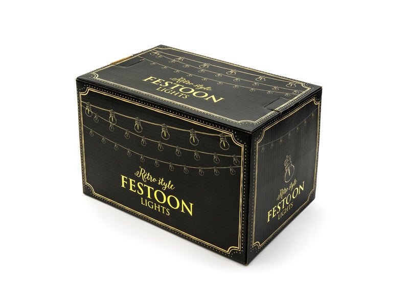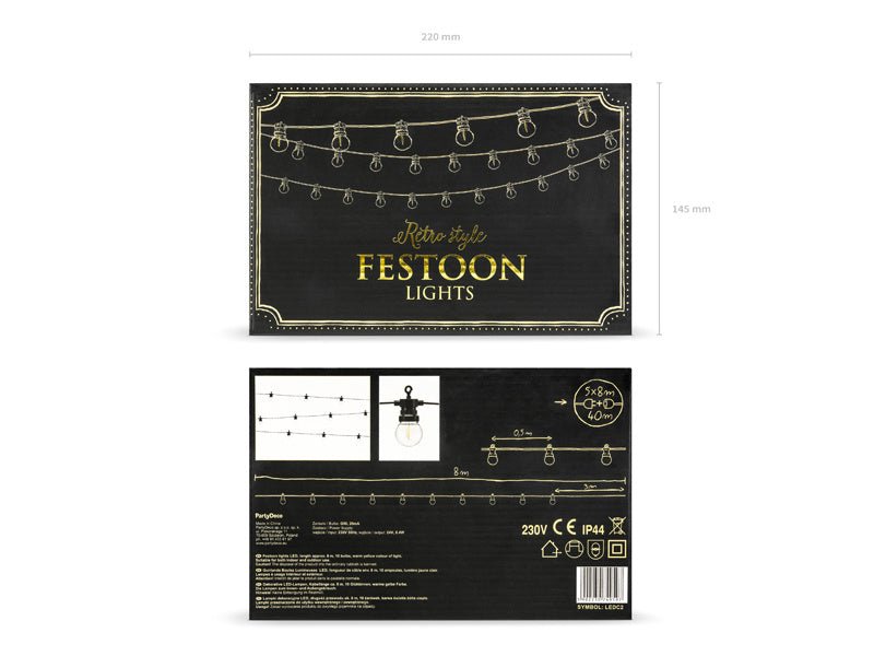 LED Festoon -lamput Retro, kirkas musta lanka, langan pituus lampuineen n. 5 m, lisäjohto n. 3 m, 10 pyöreää lamppua, valon väri lämmin keltainen. Sopii sekä sisä- että ulkokäyttöön. Valoja voidaan kytkeä jopa 5 sarjaa. Ei sisällä UK-pistoketta.