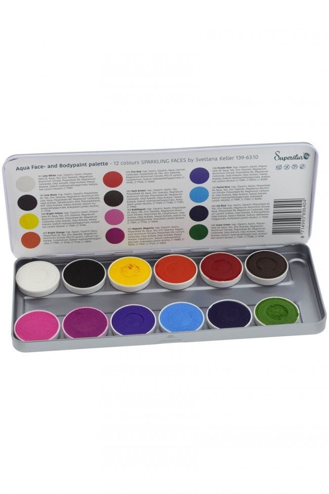 Svetlana Kellerin Superstar Face Paint Palette Sparkling Faces sisältää 12 väriä laadukasta vesimeikkiä, joka täyttää tiukan eurooppalaisen kosmetiikkalainsäädännön (1223/2009/EY) vaatimukset.