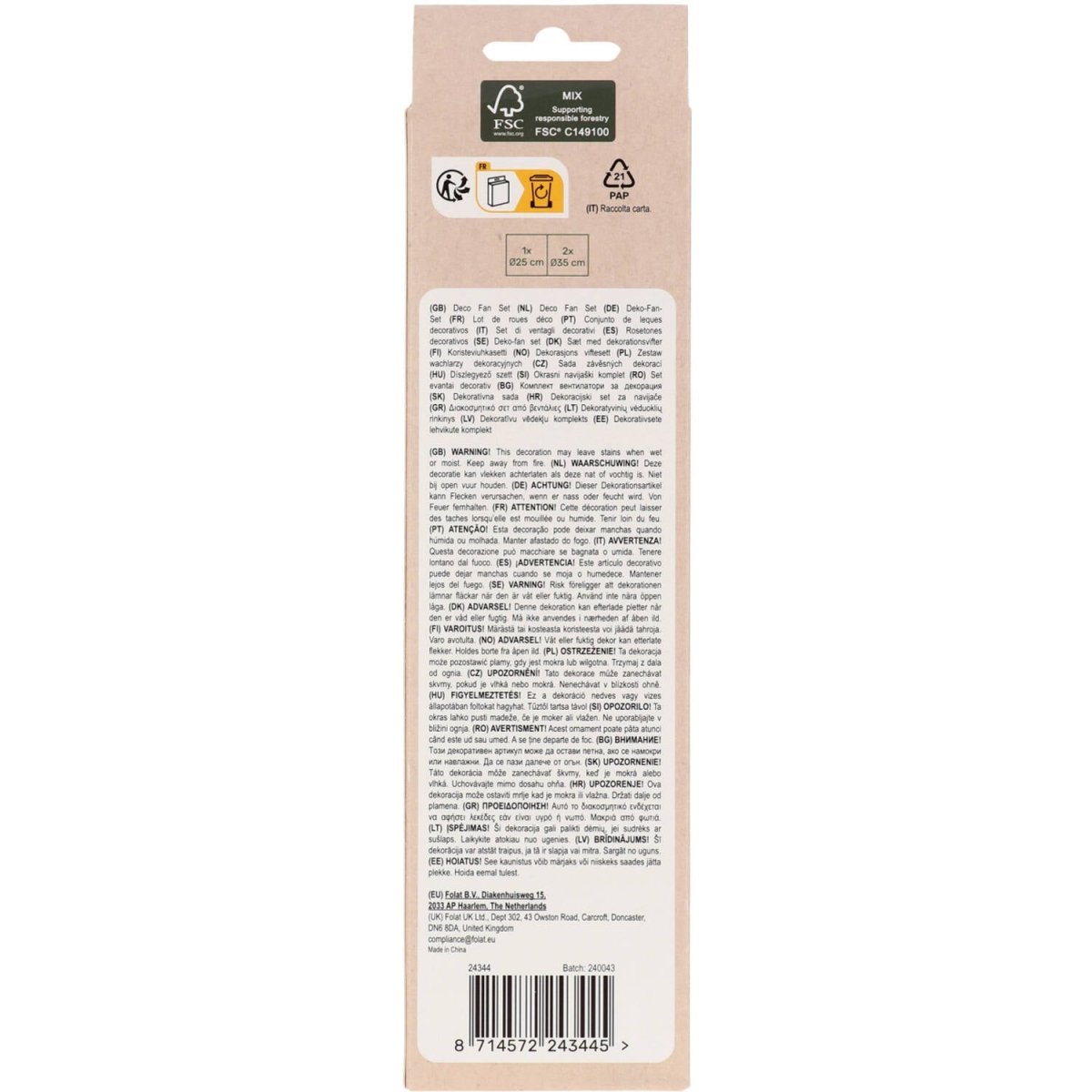 Juhli vihreällä! Deco Fan Set - Serene Sage - 3 kpl. Sisältö: 3 koristeviuhkaa. Käytettävissä esimerkiksi seuraavissa juhlissa/juhlatilaisuuksissa: Syntymäpäivä, teemajuhlat. Lumoavat vihreät koristeviuhkat, joissa on erilaisia kuvioita neljässä vihreän sävyssä. Mukana on kaksi suurta, halkaisijaltaan 35 cm: yksi raidallinen 2 vihreän sävyllä ja yksi 3 vihreän sävyllä. Lisäksi pienempi koko, jonka halkaisija on 25 cm: 2 vihreän sävyä. Viuhkat on pakattu taitettuina, ja ne voidaan helposti avata ennen käyttöä. Jokaiseen tuulettimeen on kiinnitetty puuvillanaru ripustamista varten. Mukana paperiliittimiä, jotta viuhkat pysyvät pyöreinä. Painettu molemmin puolin. Tämä tuote on valmistettu FSC-paperista.