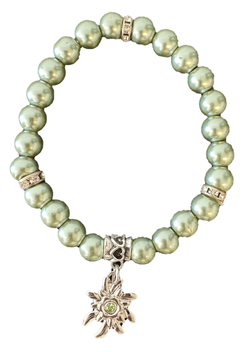 Lisää luonnollista ja tyylikästä tyyliä kaikkiin asuihin tällä vihreällä rannekorulla, jossa on helmiä ja edelweissia. Tyylikäs muotoilu tekee rannekorusta sopivan jokapäiväiseen käyttöön tai erityiseksi lahjaksi.