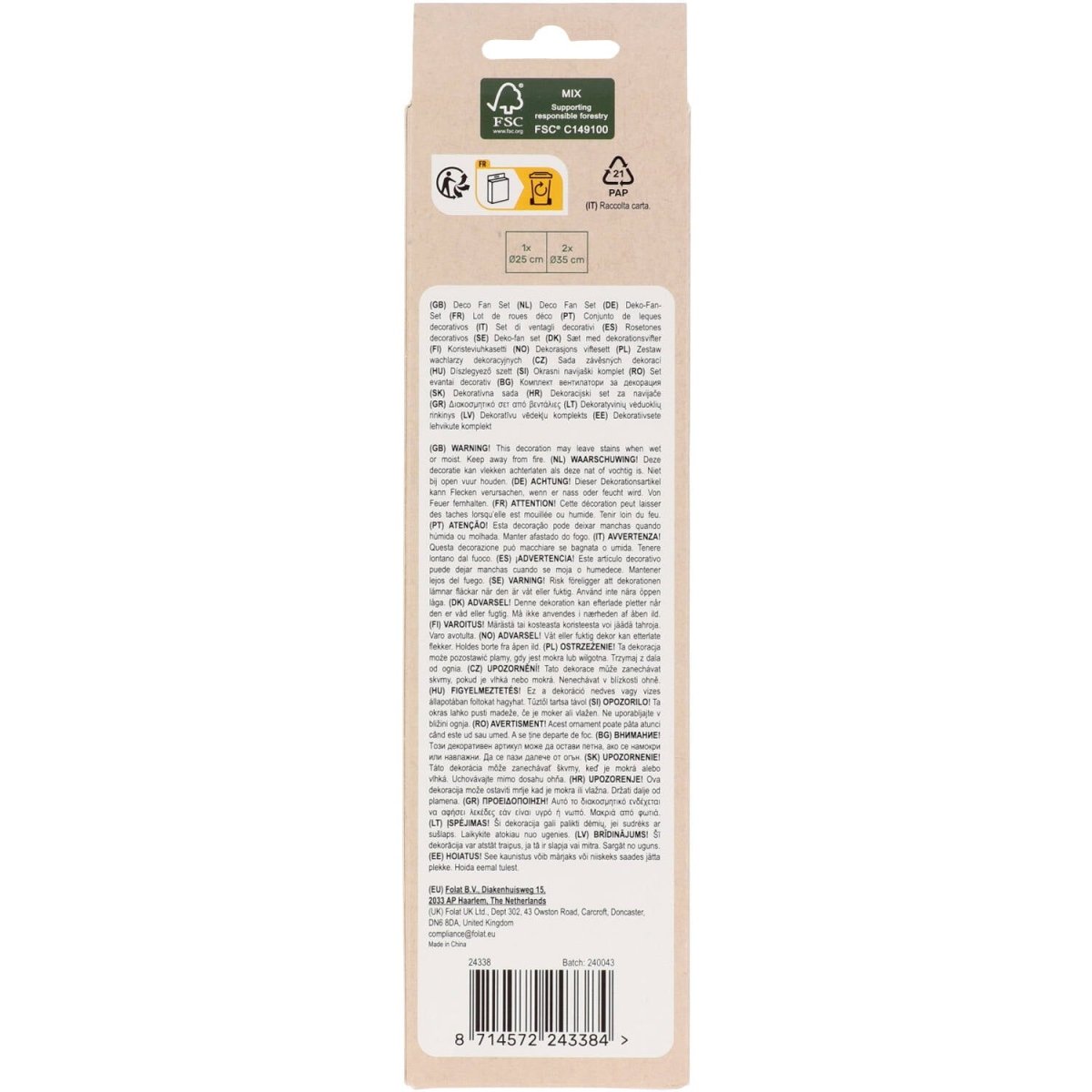 Juhli violetilla! Deco Fan Set - Posh Purple - 3 kpl. Sisältö: 3 koristeviuhkaa. Käytettävissä esimerkiksi seuraavissa juhlissa/juhlatilaisuuksissa: Syntymäpäivä, teemajuhlat. Lumoavat violetit koristeviuhkat, joissa on erilaisia kuvioita neljässä violetin sävyssä. Mukana on kaksi suurta, joiden halkaisija on 35 cm: yksi raidallinen, jossa on 2 violetin sävyä ja yksi, jossa on 3 violetin sävyä. Lisäksi pienempi koko, jonka halkaisija on 25 cm: 2 violetin sävyä. Tuulettimet on pakattu kokoontaitettuina, ja ne voidaan helposti avata käyttöä varten. Jokaiseen tuulettimeen on kiinnitetty puuvillanaru ripustamista varten. Mukana paperiliittimiä, jotta viuhkat pysyvät pyöreinä. Painettu molemmin puolin. Tämä tuote on valmistettu FSC-paperista.