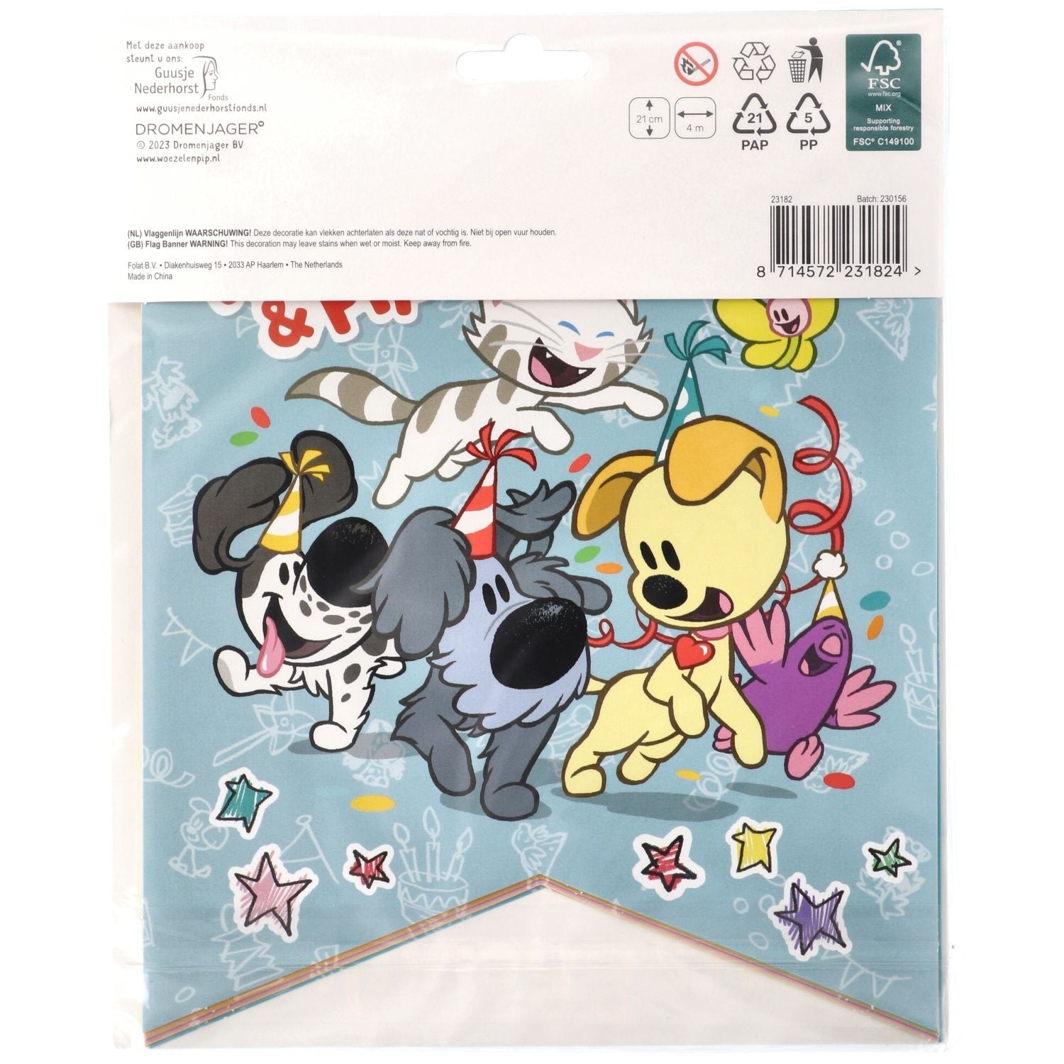 Mikä hauska ystäväporukka! Lippusiima, Woezel ja Pip, 4 metriä. Sisältö: 1 lippusiima. Käytettäväksi esimerkiksi seuraavissa juhlissa/juhlatilaisuuksissa: Syntymäpäivä, Lastenjuhlat. Iloinen ja juhlava lippusiima, jossa on 8 kaksipuolisesti painettua lippua. Liput on valmistettu paperista, lippusiima valkoisesta nauhasta. Tämä artikkeli on valmistettu FSC-paperista.